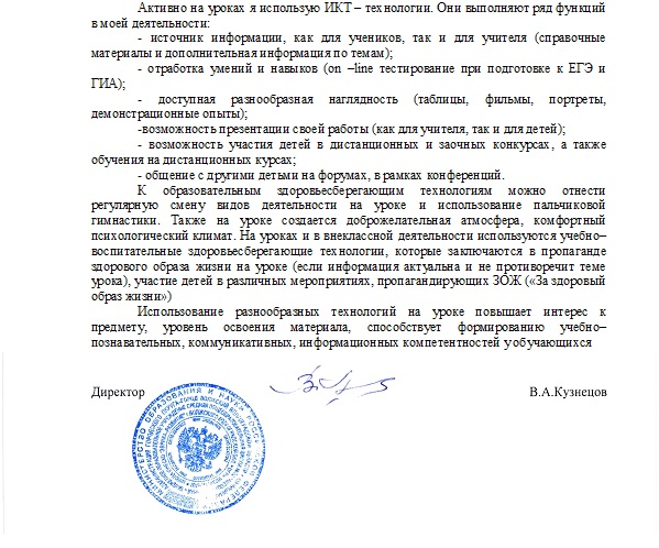 5 | Здоровьесберегающие технологии | Смена видов деятельности на уроке, пальчиковая гимнастика, пропаганда ЗОЖ и участие в мероприятиях по формированию ЗОЖ | 8-11 кл | Формирование ценностного отношения к своему здоровью, отсутствие утомляемости на уроке |